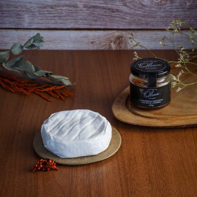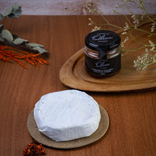 No centro do kit está o Bucaneve, um queijo tipo Brie artesanal, feito com leite orgânico pela premiada Fazenda Terra Límpida. De casca fininha e mofo branco delicado, ele revela um interior incrivelmente cremoso, com sabor amanteigado, leve acidez e um toque adocicado no final. É um queijo de personalidade — pode apresentar aroma mais intenso, o que é totalmente normal em determinadas fases da sua maturação. Uma verdadeira joia da queijaria brasileira.